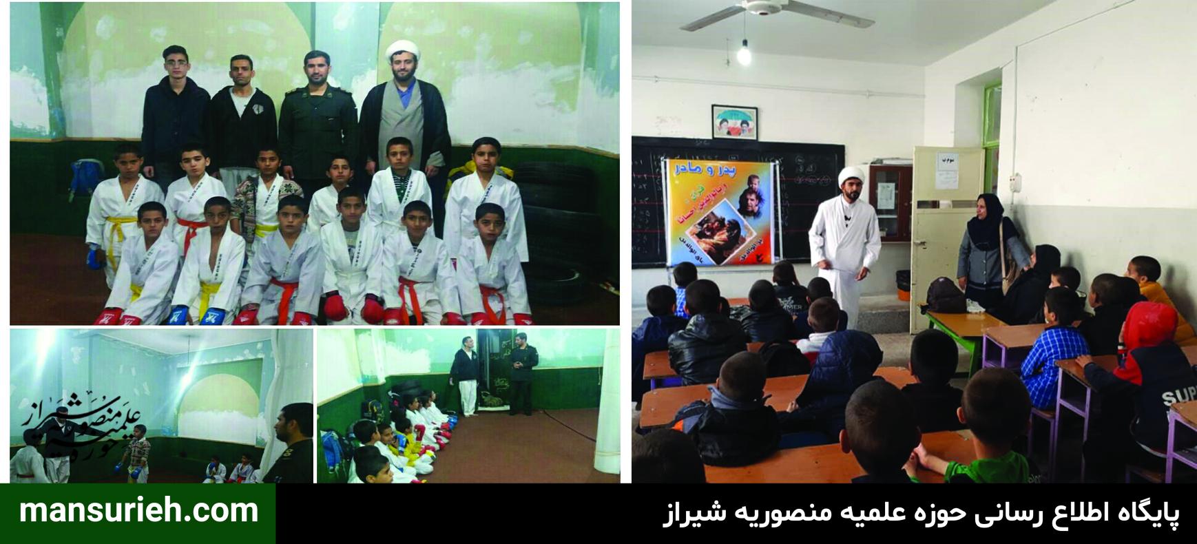 2- اعزام و حضور طلاب به مدارس آموزش و پرورش. حوزه علمیه منصوریه هر ساله تعداد 60 نفر از طلاب مستعد به مدارس شیراز، جهت اقامه نماز جماعت و بیان احکام و مسائل روز و پرسش و پاسخ اعزام می کند.